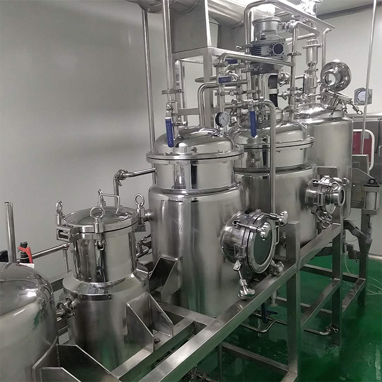 提取裝置:三層保溫結構,夾層壓力 0.3-0.4MPa、罐內壓力 0.09MPa,鏡面拋光攪拌(250W 可調速),帶 CIP 清洗 / 放氣閥 / 投料口,加熱面積 0.35M2;